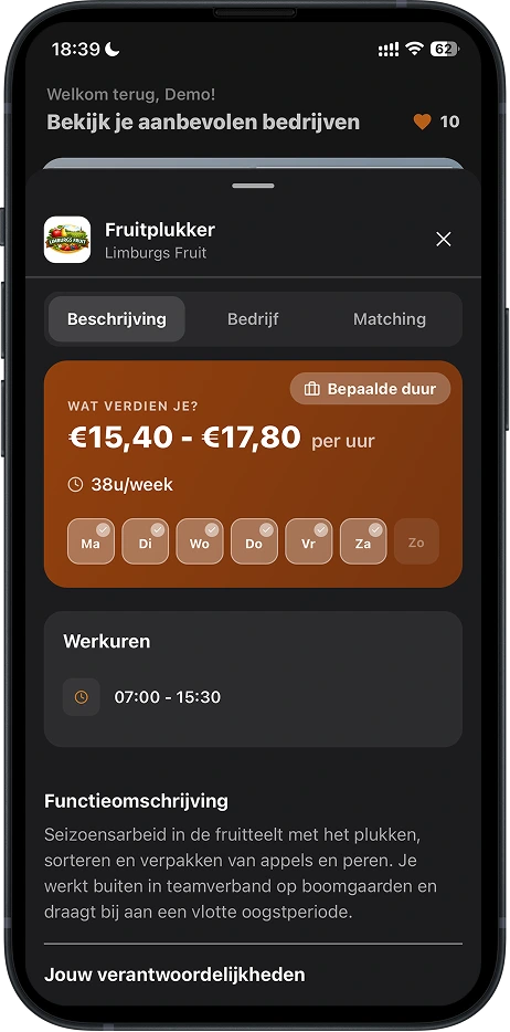 Voor vakmensen in bouw, productie en logistiek. Bekijk bedrijfsvideo’s, zie je loon en reistijd, en swipe. Gematcht? Chat direct. Geen cv’s, geen tussenpersonen.